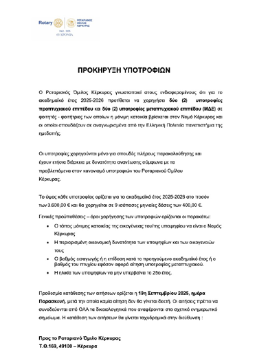 Ο Ροταριανός Όμιλος Κέρκυρας έχει τη χαρά να ανακοινώσει την προκήρυξη τεσσάρων νέων πλήρων υποτροφιών, δύο για προ- πτυχιακές και δύο για μετα- πτυχιακές σπουδές.